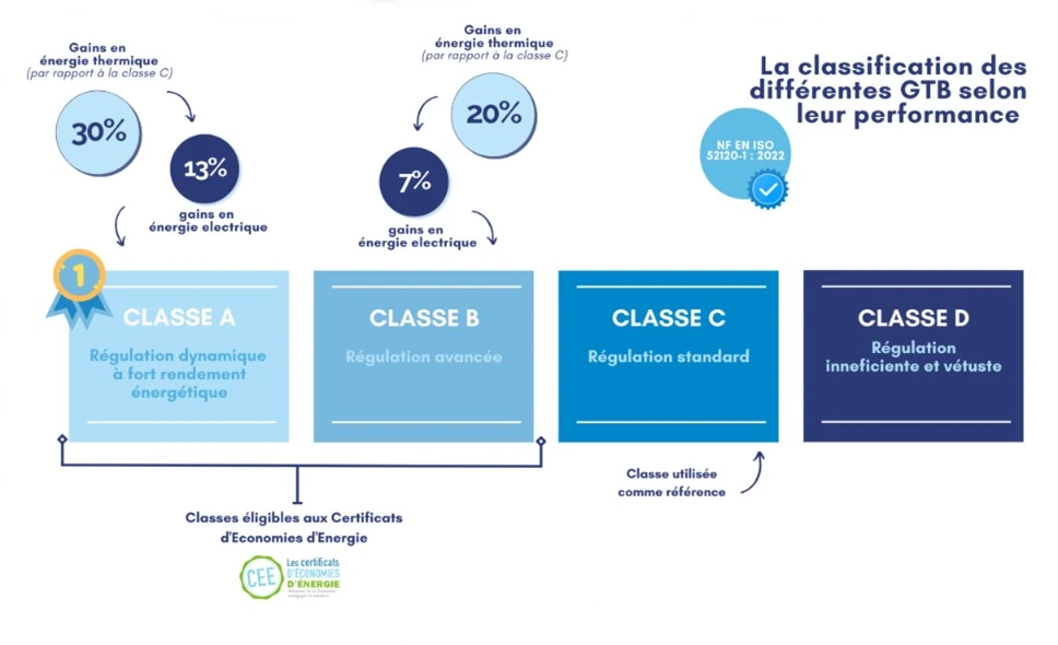 Classe C : Régulation et GTB standard. Ils permettent une optimisation basique des consommations d'énergie (exemple : régulation de la température de distribution en fonction de la température extérieure).