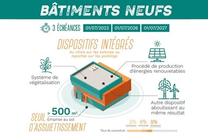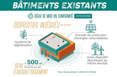 A compter du 1er janvier 2028 et en fonction de l’emprise au sol d’un bâtiment, cette nouvelle règlementation impose soit l’installation de panneaux photovoltaïques sur les toits, soit la mise en place de toitures végétalisées, soit tout autre dispositif aboutissant au même résultat (c’est-à-dire baisser la consommation d’énergie venant de fournisseurs d’énergies).
