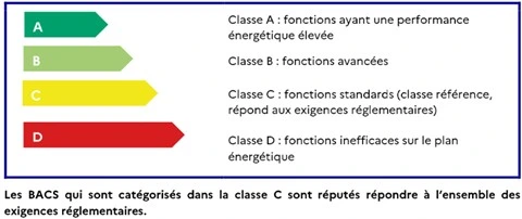 Classe A : Régulation et GTB à haute performance énergétique. Ils offrent des fonctionnalités avancées pour optimiser les consommations d'énergie, ils augmentent néanmoins la complexité et l’utilisation de la solution (exemple : détection de présence sur l’émission).